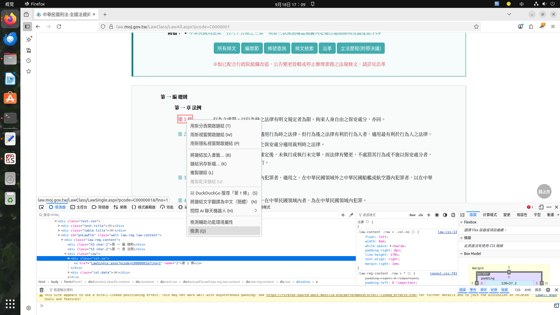 By 肥貓, 18 九月, 2025 @ 肥貓的異想世界 試用Python製作一支簡單的爬蟲程式 讀法規考古題,不外乎是要記法條。但是一條一條從全國法規資料庫慢慢複製貼上會很繁瑣。最便捷的方式無非是寫支爬蟲,逐條寫進檔案(本例是csv)。但是請留意,爬蟲請避免用在有著作權或流量限制的網站上以免觸法。在合理使用的前提下,使用政府的開放資料還是比較妥當。以我國刑法為例,進入全國法規資料庫刑法的網頁後,在條文處按右鍵->檢測,我們要看這html文件的階層分佈。知道他的物件Class為"col-no";同樣看到內文的物件Class為"law-article"