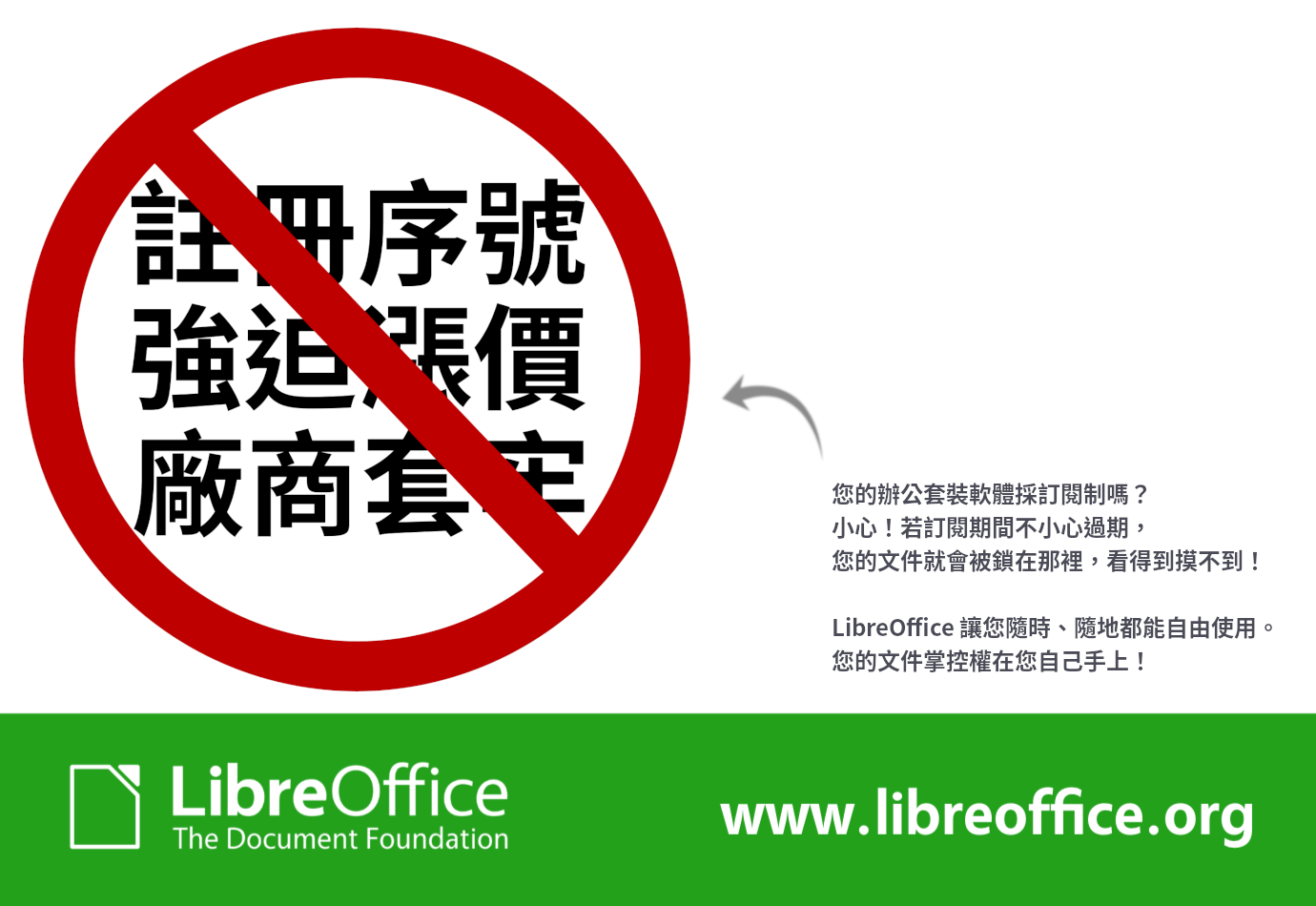 LibreOffice 是一個自由開源、由全球社群開發、沒有訂閱、註冊、年度授權費用或類似東西的辦公室套裝軟體。你可以隨意使用它(以 Mozilla 公眾授權條款 2.0 授權)。你可以在自己的電腦上安裝 LibreOffice,並隨時隨地使用它,就算是離線也一樣。
