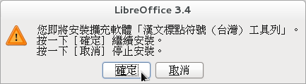 - LibreOffice 會彈出對話窗提示你即將安裝「漢文標點符號(台灣)工具列」擴充套件