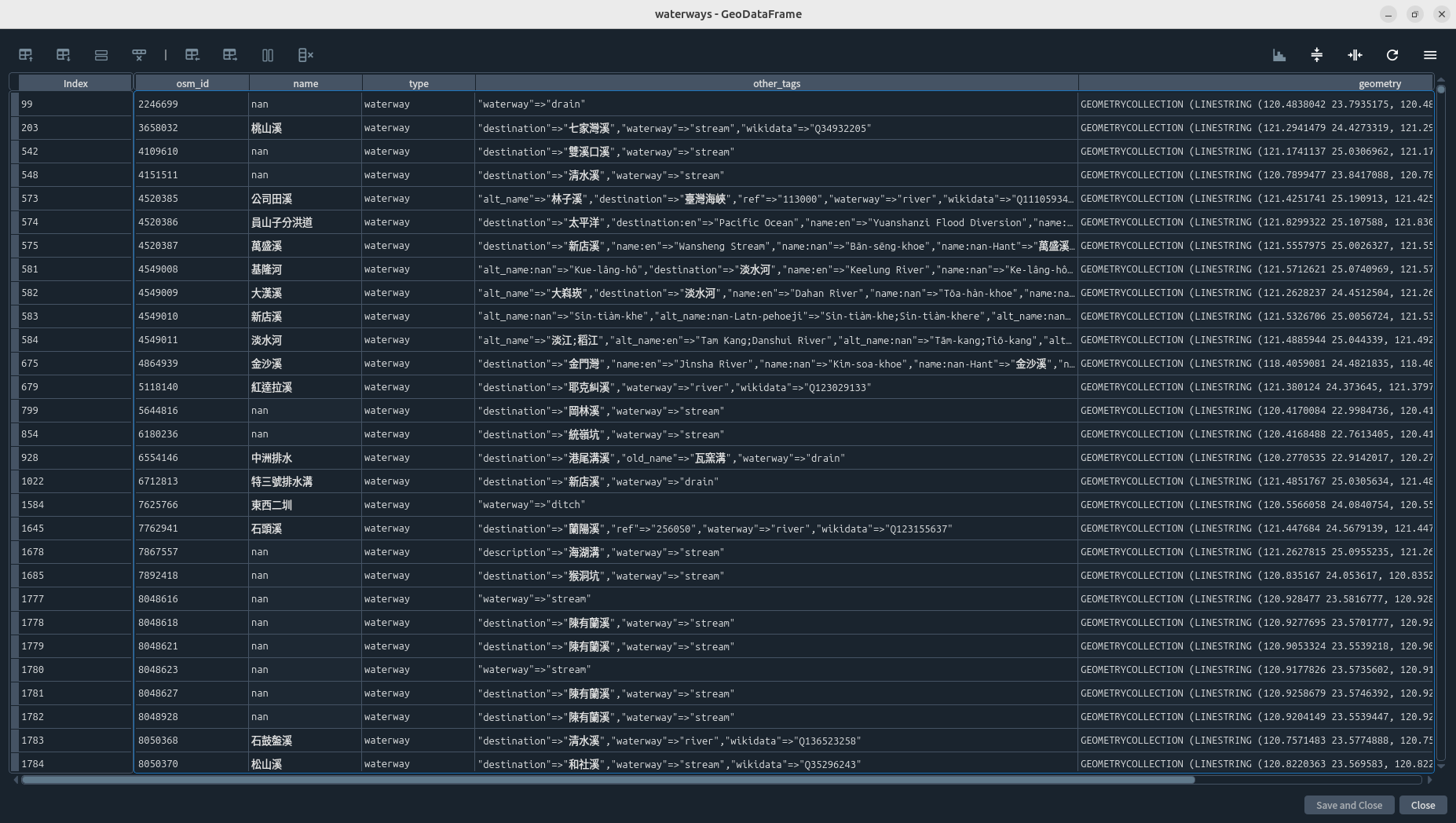 反觀pbf雖然一開始稍微醜了一點,但是在other_tags欄位卻完整保留了水系之間的關係。接下來我會說明怎麼處理(完整語法請參見)。