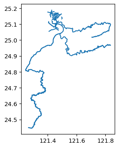 danshui_river_main2["geometries"] = danshui_river_main2.apply(lambda x: [g for g in x.geometry.geoms], axis=1)