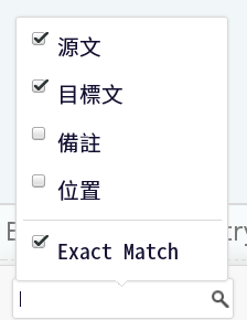 源文就是來源的原文;目標文就是目標的譯文。Exact Match 就是「精確搜尋」,是指搜尋時也同時比對字母大小寫。