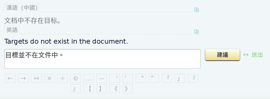 在此例中,下方還可以看到「相似翻譯」,就是與你目前條目相似的翻譯,你可以直接點選想要或想改的條目,點選後此翻譯會出現在譯文的輸入框內,你可以對應修改成想要的樣子;若無修改,系統會自動勾選「尚需完善」,記得取消勾選後再按下送出或建議。